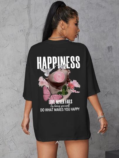 SHEIN EZwear Floral And Slogan Graphic Drop Shoulder Oversized Tee - Black - View 1