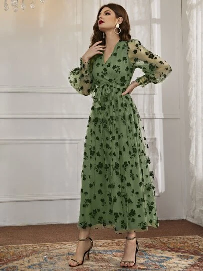 Floral Bishop Sleeve Mesh Dress - Green - View 1
