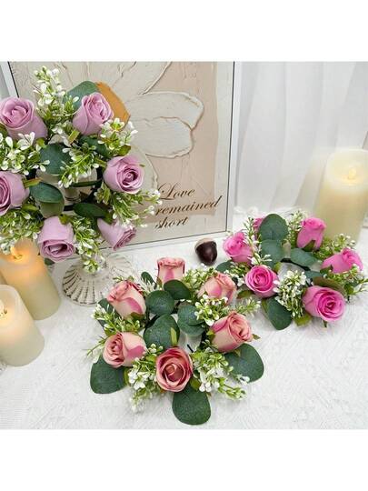 Floral Candle Ring Artificial Rose Flowers Candle Wreath For Desktop Centerpieces Decor - White - View 6