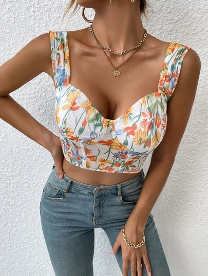 Floral Print Crop Bustier Top - Multicolor - View 1