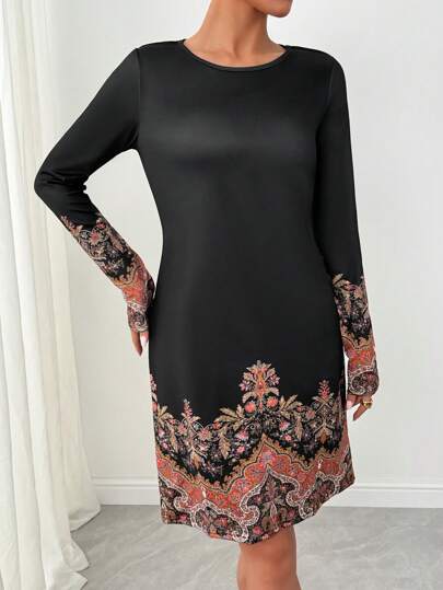 EMERY ROSE Floral Print Fitted Elegant Long Sleeve Sheath Dress - Black - View 1