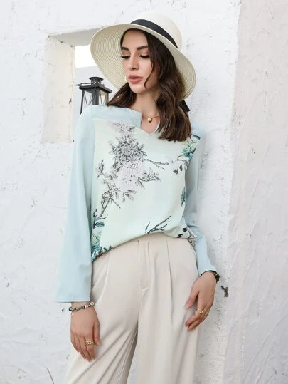 SHEIN Floral Print Longline Blouse - Mint Blue - View 1