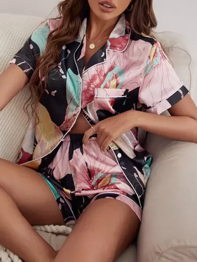 Floral Print Patched Pocket Contrast Piping Satin PJ Set / Pajama Set - Multicolor - View 1