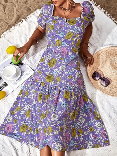SHEIN Frenchy Floral Print Puff Sleeve Ruffle Hem Dress - Purple - View 1