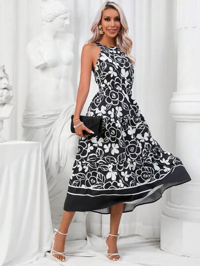 SHEIN LUNE Floral Print Ruffle Hem Halter Dress - Black and White - View 1