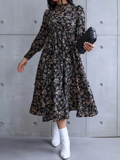 SHEIN Clasi Floral Print Shirred Cuff Dress Maxi Women Outfit - Multicolor - View 1