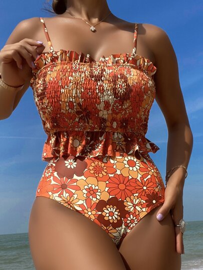 SHEIN Swim Summer Beach Floral Print Smocked Ruffle Hem Tankini - Multicolor - View 1