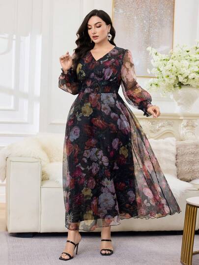 Modelyn Floral Print V-Neck Lantern Sleeve Plus Size Elegant Dress - Black - View 1