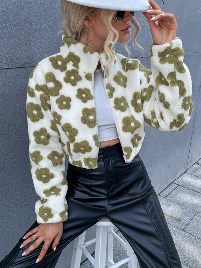 Floral Print Zip Up Drop Shoulder Crop Fleece Jacket - Multicolor - View 1