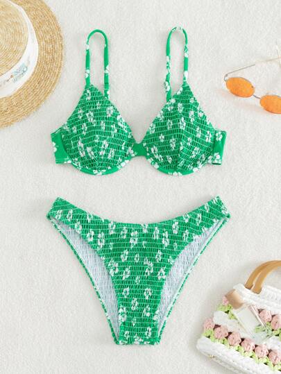 SHEIN Swim Summer Beach Floral Smocked Underwire Bikini Set - Green - View 1
