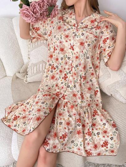 CottageSlumber Flower Printed Button Down Pajama Night Dress With Ruffle Hem Holiday Season Bountiful Floral Splendor  Cozy And Elegant Details - Multicolor - View 1