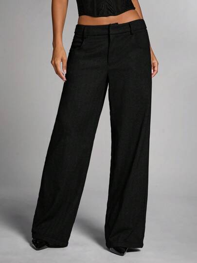 SHEIN BAE Women's Gray Solid Color Commuting Casual/Office Wear/Old Money Style/Fashion Outing/Autumn And Winter Warm Woolen Twill Straight Trousers/Winter Women Pants - Black - View 1