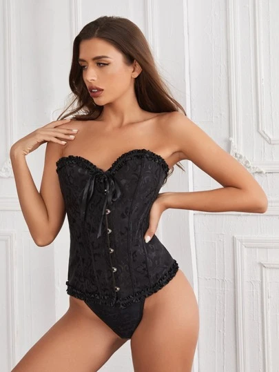 Frill Trim Lace-up Corset With Thong - Black - View 1