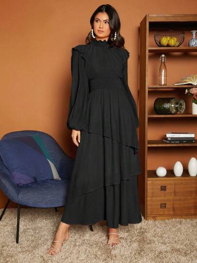 SHEIN Privé Frill Trim Lantern Sleeve Ruffle Trim Shirred Waist Dress - Black - View 1
