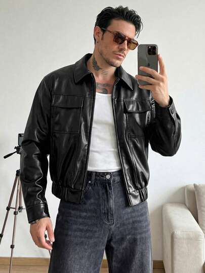 GENTILAND Men's Solid Color Long Sleeve Zip-Up Collar Utility Pocket PU Leather Jacket Mens Leather Jacket Mens Cropped Jacket Black Leather Jacket Men Mens Casual Jacket Cropped Men Jacket - Multicolor - View 1