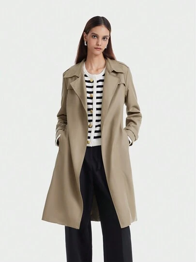 GOELIA 100% Merino Wool Solid Self Belted Trench Coat - Green - View 1