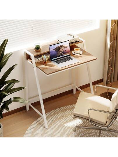 GOFLAME Computer Desk With Monitor Stand,80 Cm Small Desk Compact Desk With Ample Storage Space, 2-Tier Workstation Desk, Space-Saving Study Writing Table Dressing Table With Trapezoidal Structure For Home Office - Khaki - View 1