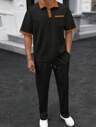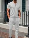 1 Set Men Casual Solid Color Waffle Knit Short Sleeve Zipper Collar Polo Shirt + Long Pants 2 Pieces Set, Summer Men Casual Sports Suit