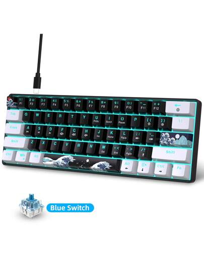 Gaming Keyboard Mechanical Keyboard Blue Switche E-Sports Game 61-Keys Mechanical Keyboard Mixed Color Backlit Keyboard For DIY Keycaps USB-C Plug And Play Suitable For Windows, PC, For Box For ONE Gamers - Black/White(Blue Switches) - View 1