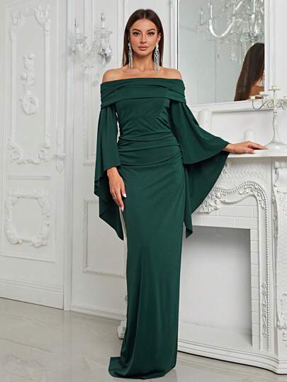 YISIKADO Off Shoulder Flounce Sleeve Ruched Dress - Dark Green - View 1