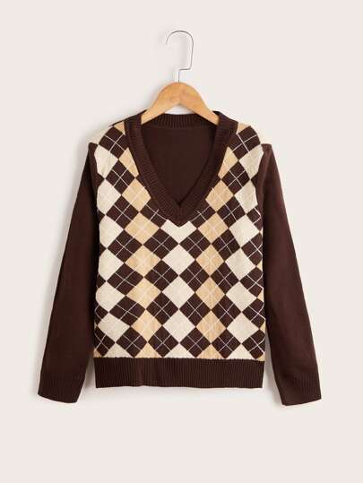Girls Argyle Pattern V Neck Jumper - Multicolor - View 1