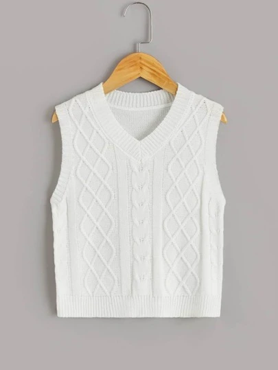 Girls Cable Knit V-neck Sweater Vest - White - View 1