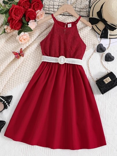 Girls Contrast Lace Halter Neck Dress With Belt - Burgundy - View 1
