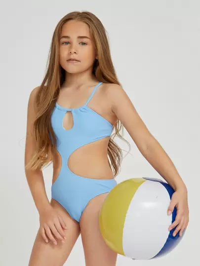 SHEIN Girls Cut Out One Piece Swimsuit - Baby Blue - View 1