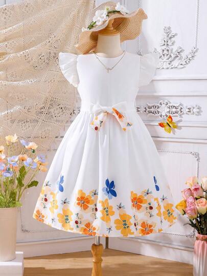 Girls Floral Print Ruffle Trim Belted Dress - White - View 1