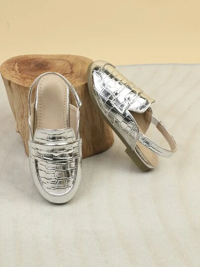 Girls Metallic Crocodile Embossed Slingback Flat Loafers - Silver - View 1