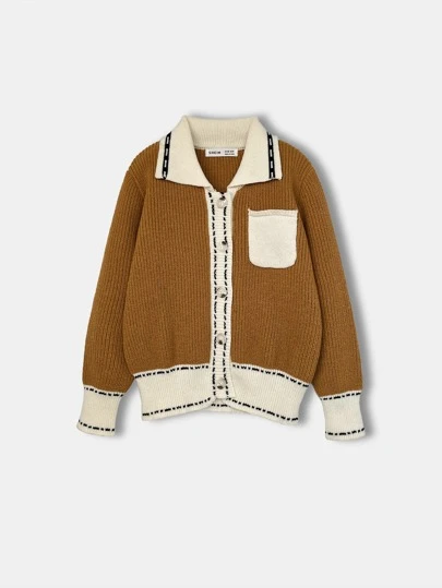 Girls Striped Trim Patched Pocket Cardigan - Brown - View 1