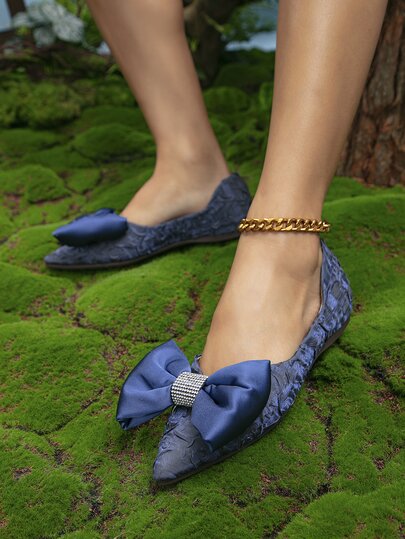 Glamorous Blue Ballet Shoes Women Rhinestone & Bow Decor Point Toe Satin Flats - Blue - View 1