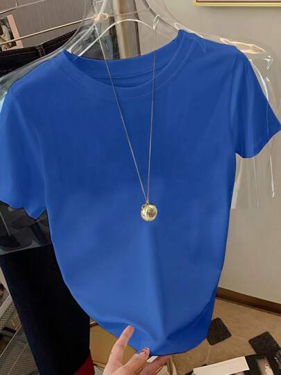 INAWLY Women Round Neck Short Sleeve T-Shirt, Minimalist Style Suitable For Summer - Blue - View 1