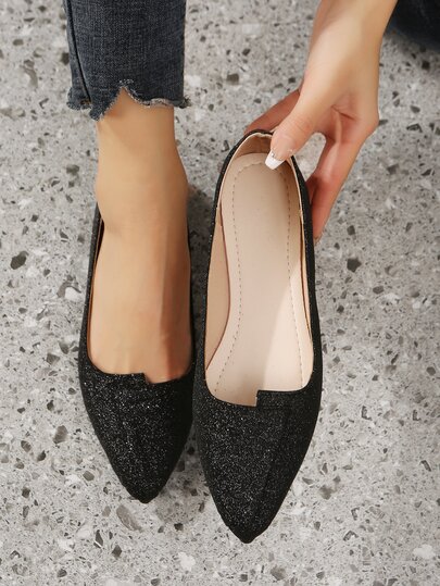 Glitter Point Toe Ballet Flats - Black - View 1