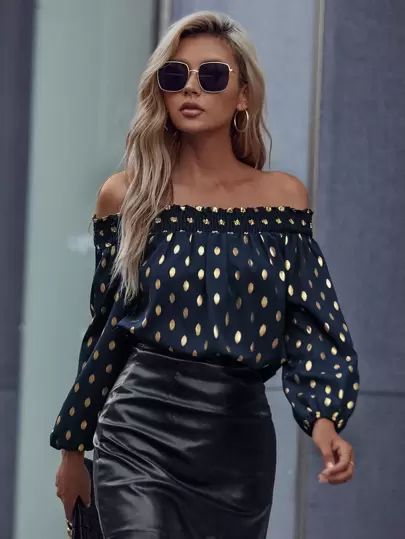 EMERY ROSE Gold Dot Print Off Shoulder Shirred Blouse Fall Cloth For Women - Navy Blue - View 1