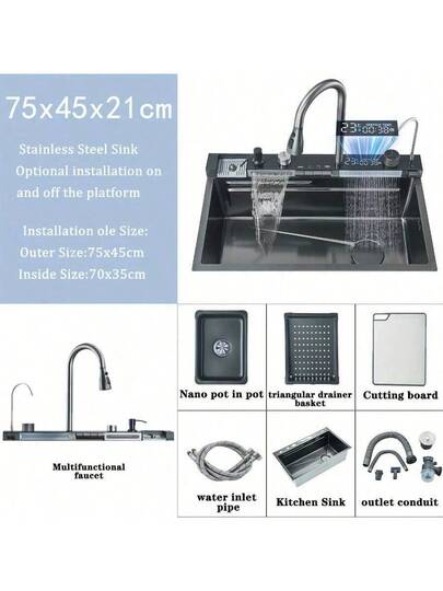 Gray Recessed Waterfall Kitchen Sink Workstation Recessed Kitchen Sink Stainless Steel Sink Multifunctional Single Bowl Kitchen Sink Smart Display With Faucet And Cup/Soap Dispenser