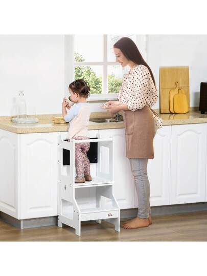 HOMCOM 2 In 1 Kids Kitchen Step Stool With Rail Toddler Steps With Chalkboard For Kitchen Bathroom, White - White - View 1
