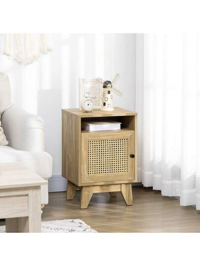 HOMCOM Bedside Table Nightstand With Storage Shelf And Door Cupboard, Side End Table With Rattan Element For Living Room, Bedroom, Natural - Natural Oak - View 1