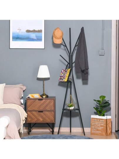 HOMCOM Freestanding Metal Coat Rack Stand 9 Hooks Clothes Tree With 1 Shelf Hat Display Hall Tree Hanger Bag Umbrella Hanging Organiser Black - Black - View 1