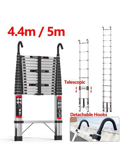 HSHa 4.4m/5m Telescopic Ladder Stainless Steel Heavy Duty Extendable Loft Telescopic Ladder Adjustable Height With Detachable Hooks, Anti-Slip And Durable, Retractable - 4.4m-hooks - View 1