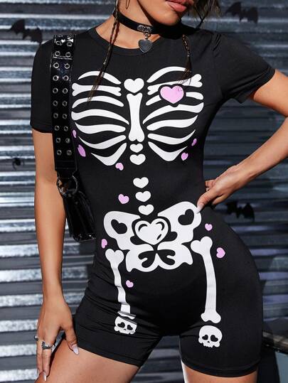 Halloween Skeleton & Heart Print Unitard Romper - Black - View 1