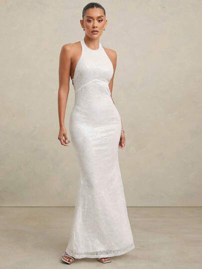 L'Amorae Halter Neck Gown In Sequin Lace With Lace Up Back - White - View 1