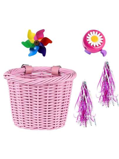 Handmade Woven Bicycle/Scooter Basket + Mini Pinwheel + 1 Pair Streamers + Bell - Pink - View 1