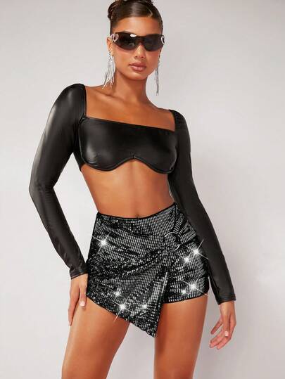 Hauture Metallic O-Ring Wrap Hem Mini Skort - Black - View 5