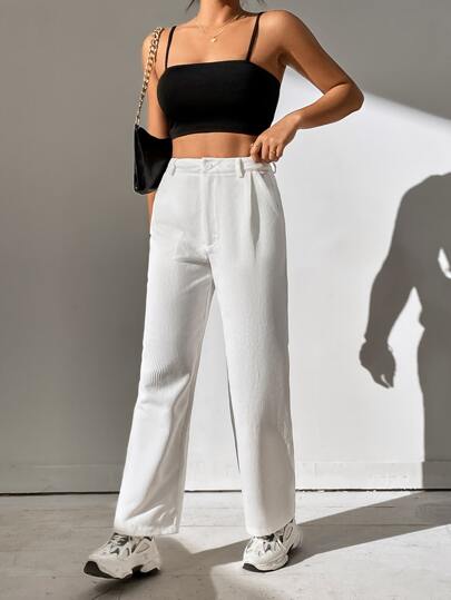 SHEIN PETITE High Waist Corduroy Wide Leg Trousers - White - View 1