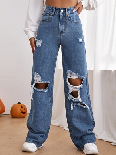 High Waist Cut Out Ripped Wide Leg Jeans - Medium Wash - View 1