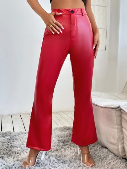 SHEIN PETITE High Waist PU Leather Flare Leg Trousers - Red - View 1