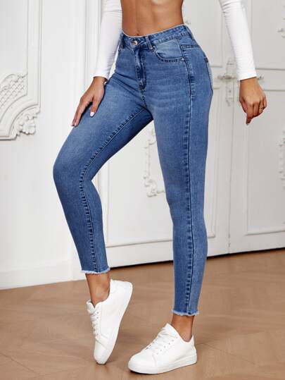 SHEIN Essnce High Waist Raw Hem Skinny Jeans - Dark Wash - View 1