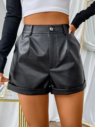 SHEIN EZwear Summer Black Y2k High Waist Roll Up Hem PU Shorts - Black - View 1