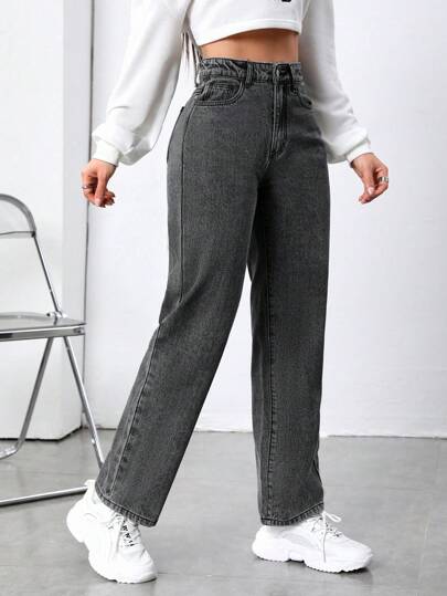 SHEIN PETITE High Waist Straight Leg Jeans - Black - View 1
